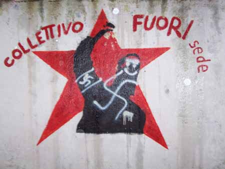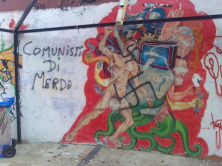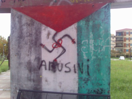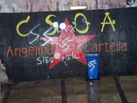 E così, mentre eravamo insieme ad altri -per fortuna tanti- a Villa San Giovanni per confrontarci sulle prossime iniziative da mettere in piedi in vista della manifestazione No Ponte del 19 dicembre, i soliti imbrattini armati di bombolette e tanta fantasia si sono dati da fare per abbellire lo spazio del Cartella! E via così a svastiche, celtiche, inni al Dux nonché apprezzamenti di varia natura artisticamente vergati su muri e porte.