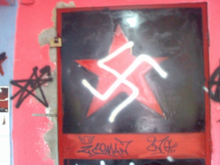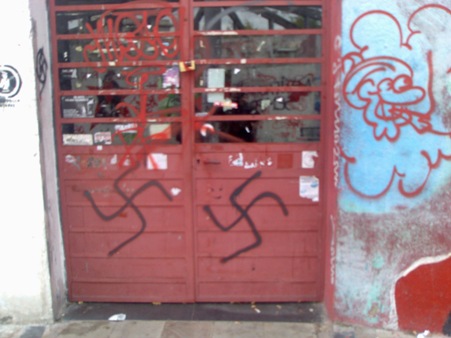 E così, mentre eravamo insieme ad altri -per fortuna tanti- a Villa San Giovanni per confrontarci sulle prossime iniziative da mettere in piedi in vista della manifestazione No Ponte del 19 dicembre, i soliti imbrattini armati di bombolette e tanta fantasia si sono dati da fare per abbellire lo spazio del Cartella! E via così a svastiche, celtiche, inni al Dux nonché apprezzamenti di varia natura artisticamente vergati su muri e porte.